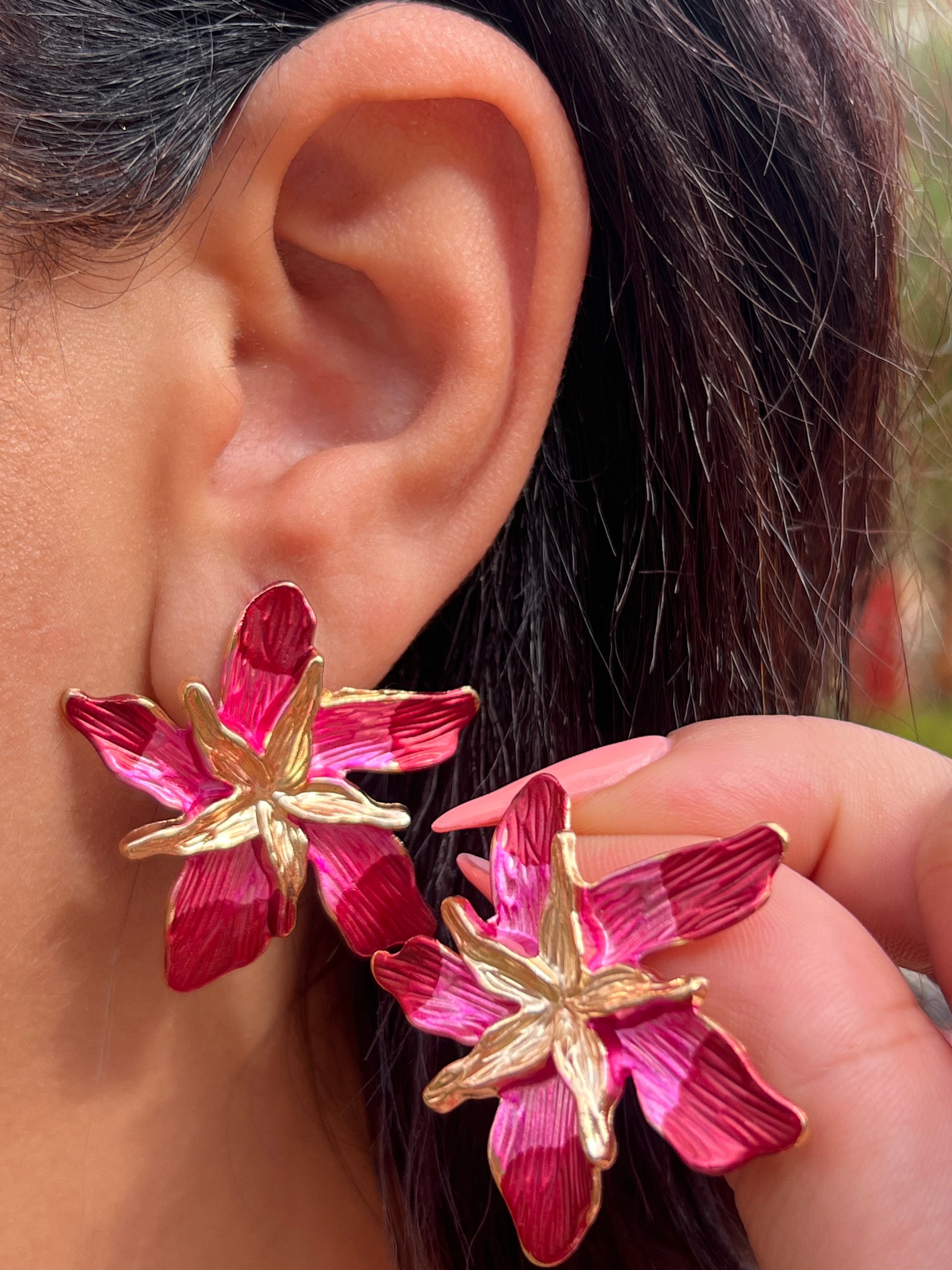 These flower-shaped statement earrings feature rich crimson petals with gold accents, designed to add depth, shine, and confidence to any look.